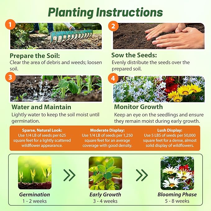 - FLEXIBLE SEEDING RATES: Sowing rate of 1/4 LB per 625-1,250 SF or 5 LBS per 25,000-50,000 SF. Perfect for various applications, from backyard flower beds to large meadows. The bulk wildflower seeds are also drought-tolerant and deer-proof, making them an excellent choice for sustainable gardening.
