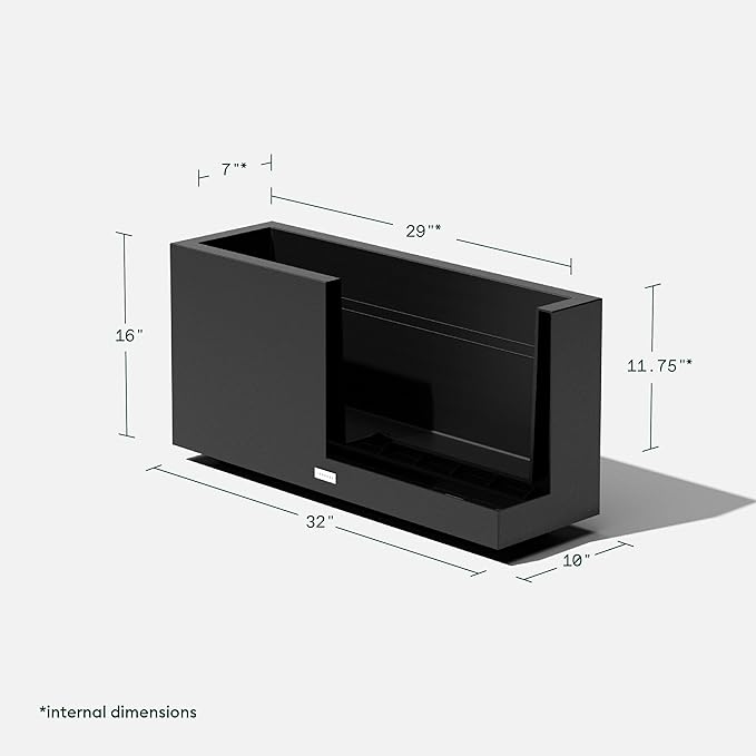 - DIMENSIONS & DETAILS: This double-walled planter’s exterior dimensions measure 16” in Height, 10” in Width, 32” in Length, and the interior dimensions measure 11.75” in Height, 7” in Width, 29” in Length. It comes fully assembled for easy use