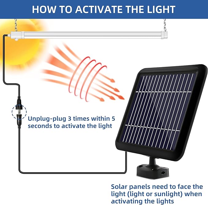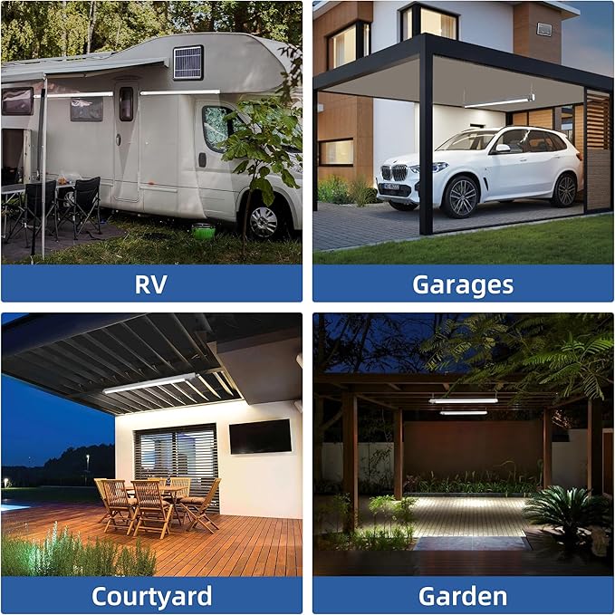 - Energy Efficient:Powered by solar energy, no need for grid electricity. This portable solar power shop light illuminates your carport shed camper or wherever you need it, give bright lightting in locations that don't have direct access to electrical power
