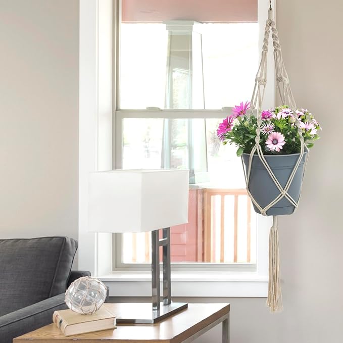 - STYLISH & DURABLE DESIGN — Modern bohemian luxe style with vintage-inspired aesthetic — Features intricate woven macramé rope twist design with tassels— Elegant off-white neutral color — Complements most décor — Makes a great gift — Made of cotton — Strong and durable — Plants and flower pots NOT INCLUDED — Measures approximately 41” L (from hook to tassel)