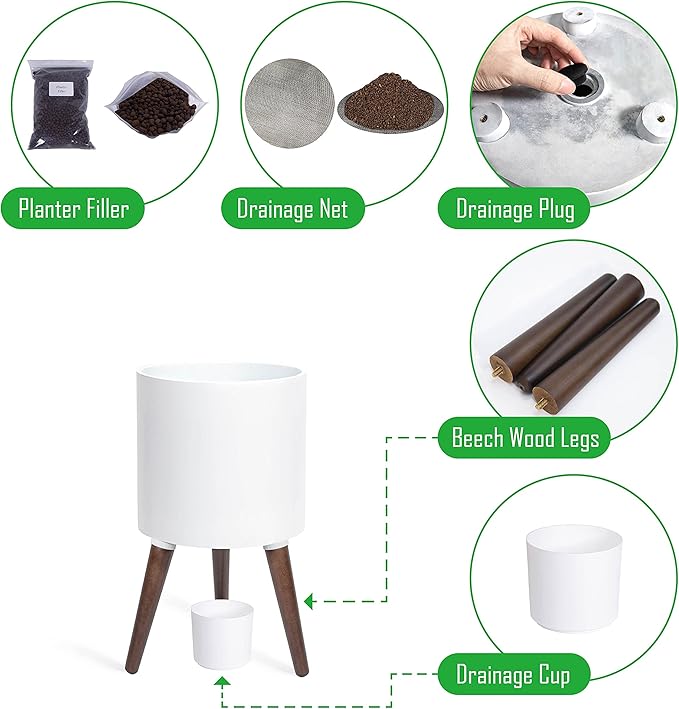 - What’s included: planter pot with drainage hole, set of stand – 3 solid wooden legs.