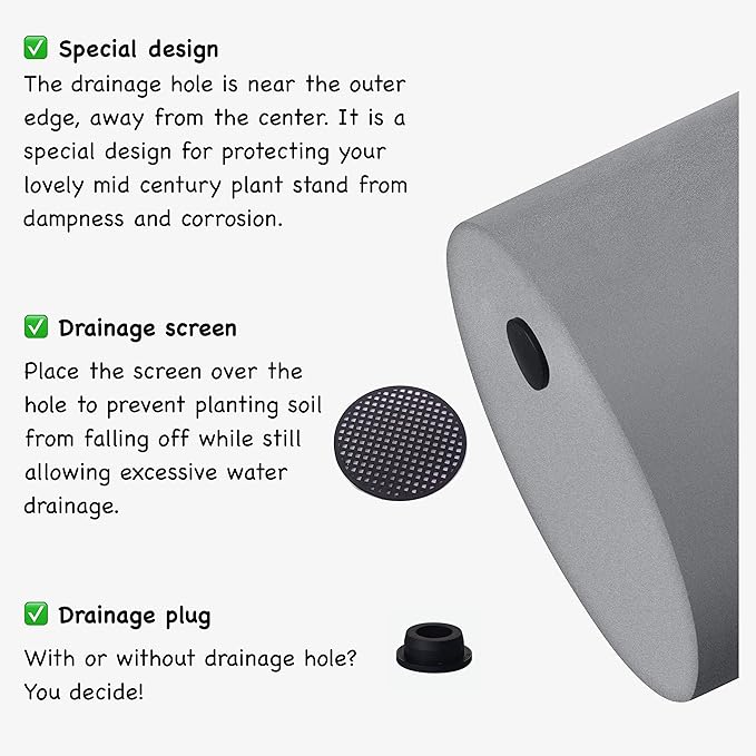 - DRAINAGE PLUG & SPECIAL DESIGN - This flower pot has a drainage hole in bottom to prevent over watering for the plants, comes with drainage plug. With or without drainage hole? You decide! The drainage hole is near the outer edge, away from the center. It is a special design for protecting your lovely mid century plant stand from dampness and corrosion.