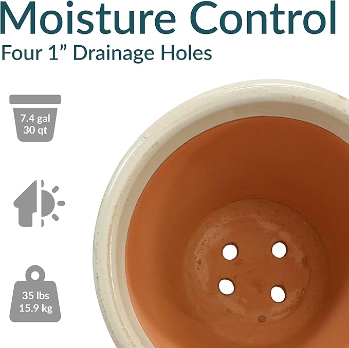 - LARGE SIZE FOR GROWING PLANTS: The large plant pot features a spacious top diameter and 7.4-gallon soil capacity that provides ample space for plants to grow. The planter has a 18.5" outer top diameter (16.5" inner diameter) x 10.5" outer base diameter (8" inner base diameter) x 15" H outer (14" H inner) and weighs 32 lbs.