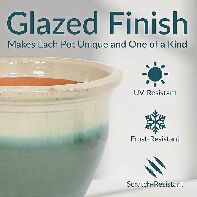 - DESIGNED FOR BEAUTY AND DURABILITY: This outdoor plant pot is crafted with a rich, hand-painted glazed finish that is kiln-fired for a classic, shining appearance. Subtle variations in color highlight the artisanal glazing process, making each piece truly unique. The durable ceramic construction offers natural UV and frost resistance, while its heavy weight adds stability to outdoor arrangements, keeping the planter upright in windy conditions.