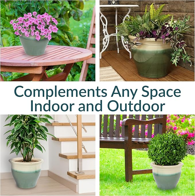 - VERSATILE PLACEMENT: Use this round garden planter on the patio, deck, or porch to add flowers to outdoor spaces, or set the planter in the sunroom, living room, or dining room to bring life to indoor spaces. If using it indoors, place a saucer (not included) beneath the flowerpot to prevent water and soil from leaking on the floor. The drainage in the bottom of the pot provides optimal air circulation and prevent water from pooling.