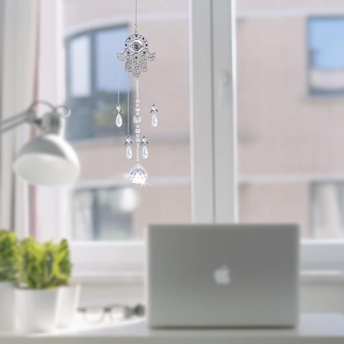 - The suncatcher ornament/pendant is consist of Hamsa hand,Turkish blue evil eye,guardian angel,crystal ball prisms and chakra healing crystal beads full of positive energies