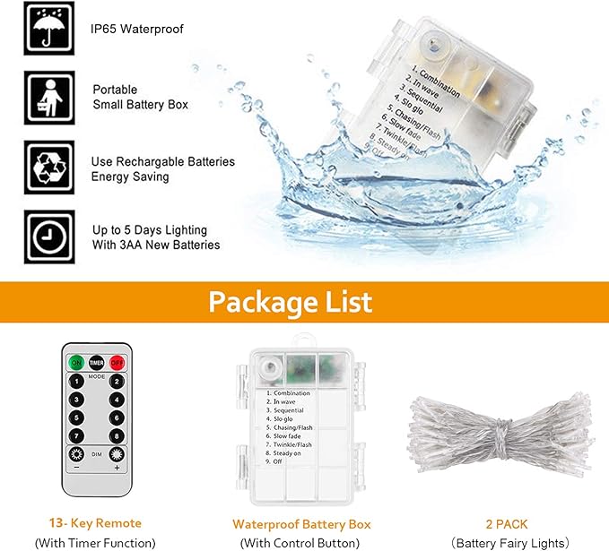 - 【Outdoor String Lights Christmas Lights】Adopted with IP65 waterproof battery box and string lights, you can easily carry and place the outdoor string lights anywhere you like, suitable for use where rain, spraying water, snow are likely. We will help you within 24 hours, please feel free to contact us.We are committed to providing you with a better shopping experience!