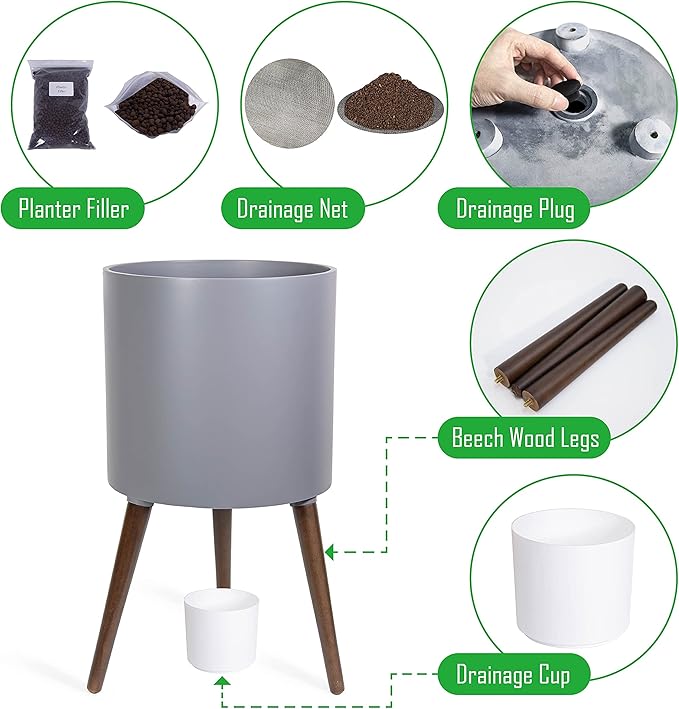 - What’s included: planter pot with drainage hole, set of stand – 3 solid wooden legs.