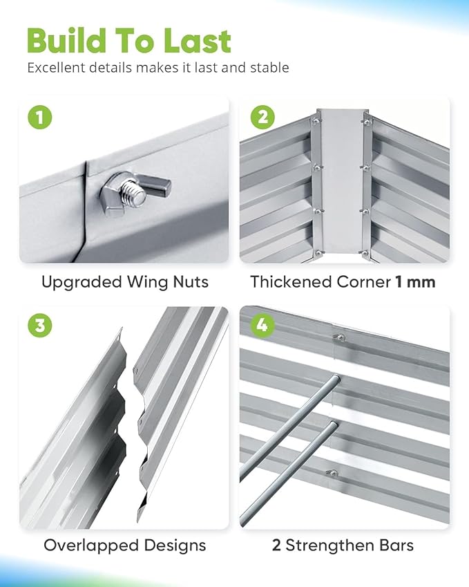 - 【Built To Last】Garden raised planting bed is made of powdered coating galvanized steel panel, assure fine condition of the metal garden bed, it's able to stand harsh weather conditions, won't crack in years, use without worry.