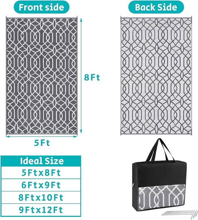 - Reversible Outdoor Rugs: Featuring a classic moroccan pattern on both sides, this 5x8 ft outdoor area rug allows you to instantly refresh your patio, porch, backyard, deck, RV campsite. And this outdoor deck rug is reversible, two-sided design allows you to have two different looks,both sides can blend perfectly with nature and look very full and comfortable.