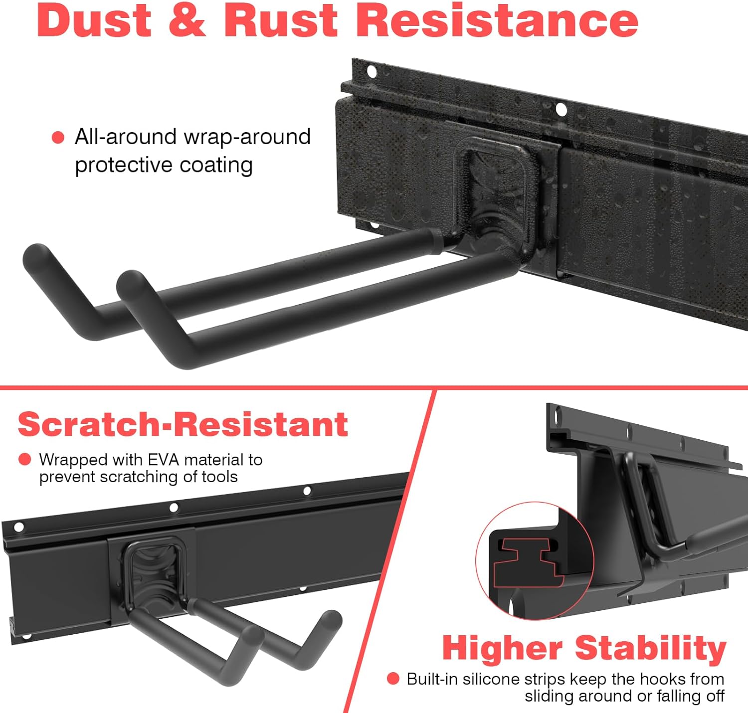- Movable Garage Storage Hooks: When garage storage needs change, the fast wall-mount hooks can snap on the rail and move around on it to meet your actual needs. And It won’t rust or chip over time