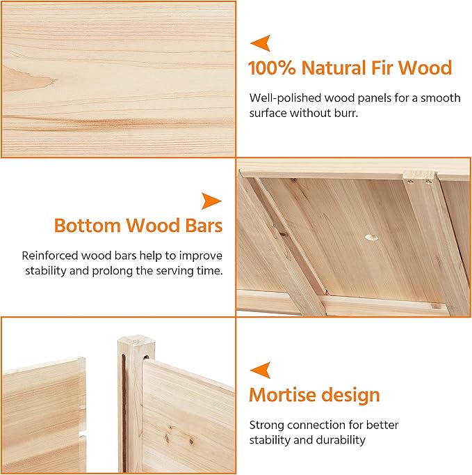 - Natural Fir Wood: This raised garden bed is made of non-paint fir wood. Thanks to its strength, stability as well as natural resistance, this natural planting bed will work well for a long time