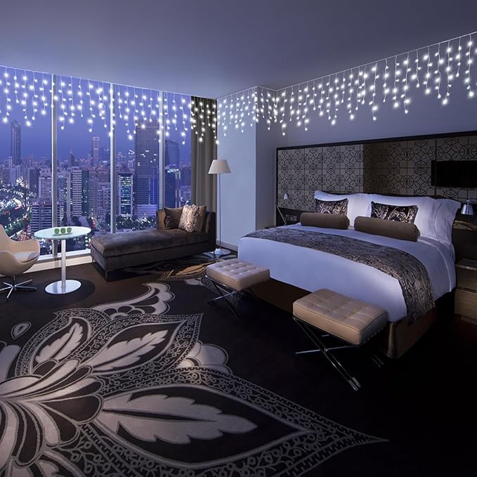 - [8 Modes Icicle Lights Outdoor] - The curtain lights has 8 different lighting modes for you: 1.Combination, 2.In Waves, 3. Sequential, 4.Slo-glo, 5.Chasing/Flash, 6.Slow Fade, 7.Twinkle/Flash, 8.Steady On. Different lighting modes controlled by only one button, directly plug in and unplug the controller for power on and off. You can easily to hang the icicle lights on the eaves, patio, garage, top of hall, balcony, wedding or anywhere you want.