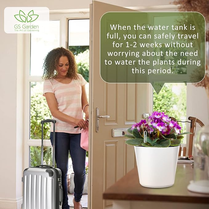 - GS Garden African violet pots function efficiently, taking care of your plants even when you can't. Self watering pots can help you keep your plants happy and thriving, even with your busy schedule. As a users, we are well aware of the joy and beauty that plants bring to the family. Self watering plant pot are specially designed planters for home gardening and modern decor. Suitable for all outdoor plants, herbs in kitchen, bedroom, study room, office, windowsill, balcony, garden, etc.