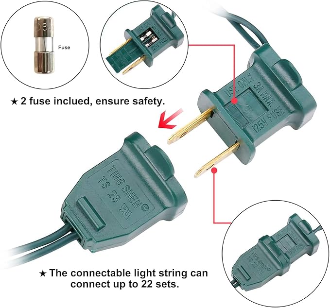 - 【Mini LED Christmas Lights Specification】: 2 Sets - green wire christmas string lights includes 100 count multicolor led lights, total length 35.3ft, lights length 33ft and each led is 4 inches apart, 24 inches lead wire, 4 inches end connector (Extra 2 x replacement bulbs and 2 x fuse included)