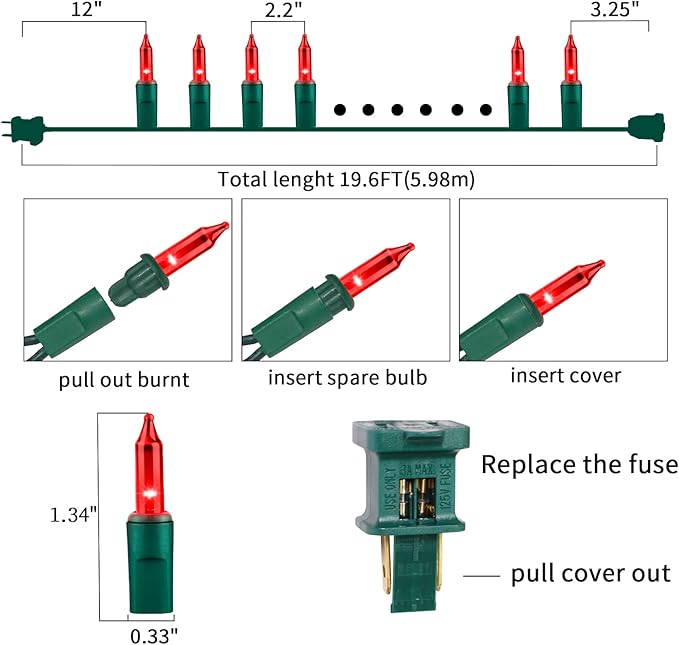 - 【Green Wire Christmas String Lights Decoration】:100L traditional incandescent Christmas light set,19.6Feet Red Christmas Mini String Lights,each set include 4 Extra Bulbs & 2 Replacement Fuses.Perfect for indoor and outdoor decoration.Plug in,put it where you want,watch and enjoy this light.The light can be reused for many years.