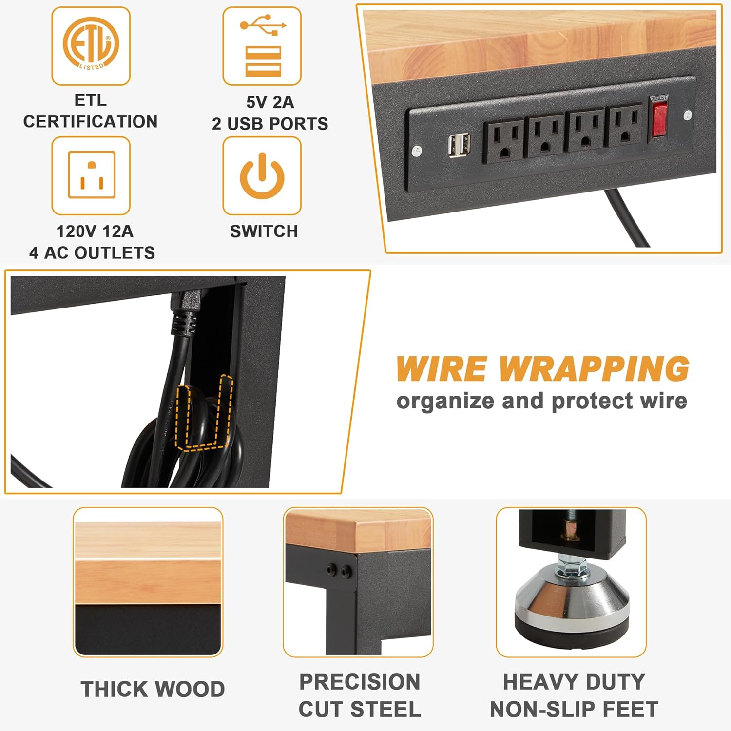 HABUTWAY Height Adjustable Workbench 60" 2000 Lbs Capacity Solid Wood Work Station Heavy-Duty Work Tables with Power Outlets for Garage Party Shop Office