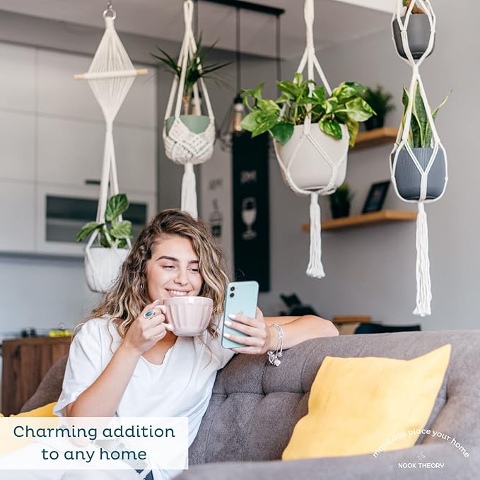 Nook Theory 4-Pack Macrame Plant Hanger - with 8 Ceiling Hooks - Hanging Planter Indoor Outdoor - Hanging Plant Holder - Decorative Bohemian Plant Hangers - Hanging Plants (Light Gray)