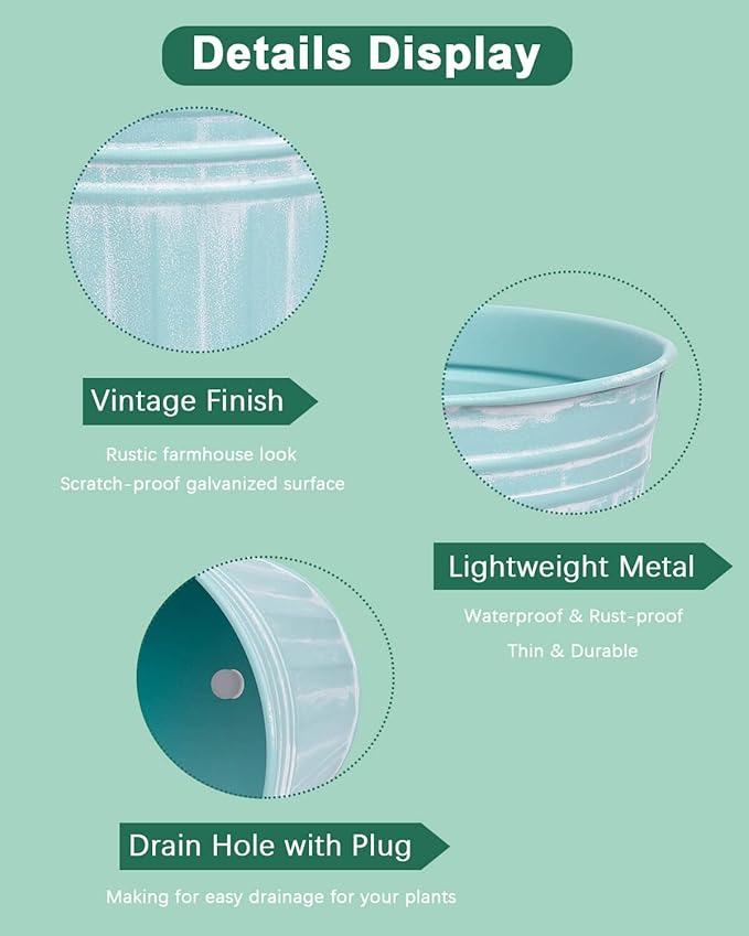 - 【Rust-proof Material】Galvanized tin planter made of high-quality iron with perfect rustic look, scratch-proof galvanized surface. The metal material is waterproof and rust-proof, relatively light, durable, and sturdy.