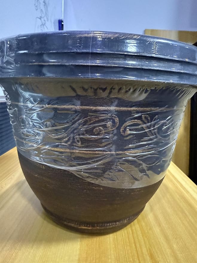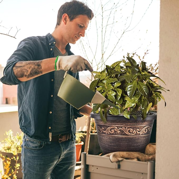 Plastic-Plant-Flower-Planters-16 Inch with Drainage Hole & Saucer, 3 Packs Lightweight Small Resin Flower Pot Indoor Outdoor, Retro Antique Imitation Decorative Garden Containers Sets for Houseplants