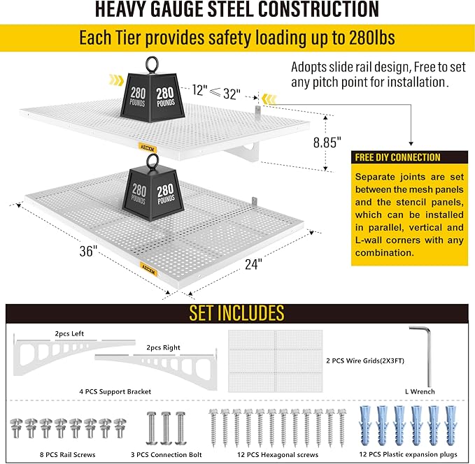 - Premium Craftsmanship: This garage wall shelving is crafted from a single steel sheet, precision-stamped and folded for strength. Unique high-density hole design enhances functionality while delivering a sleek, modern aesthetic