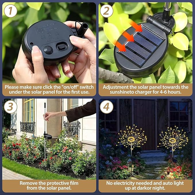 - INDEPENDENT and MORE DURABLE:A pack of solar firework lights is 2 pieces, all of which are allocated with separate solar panels.Compared with the same solar panel wiring, it will not be lit because of one. Fireworks lights outdoor has plenty of brightness