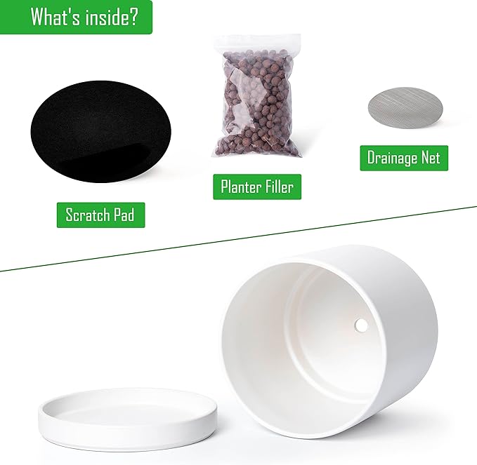 - Planter pot with drainage hole, mesh drainage net and protective scratch pad included.