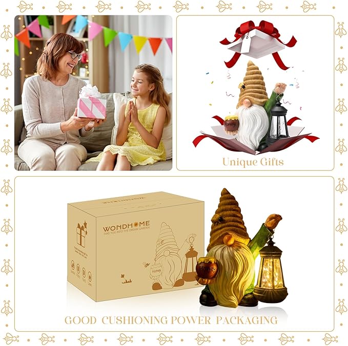 - 【Premium Quality】 This garden gnome statue made of durable resin materials, waterproof and anti-fading. The product is equipped with advanced solar chips, which can light up for long time; Whether it's spring, summer, fall or winter, the solar bee gnomes are a great choice for indoor or outdoor decorating