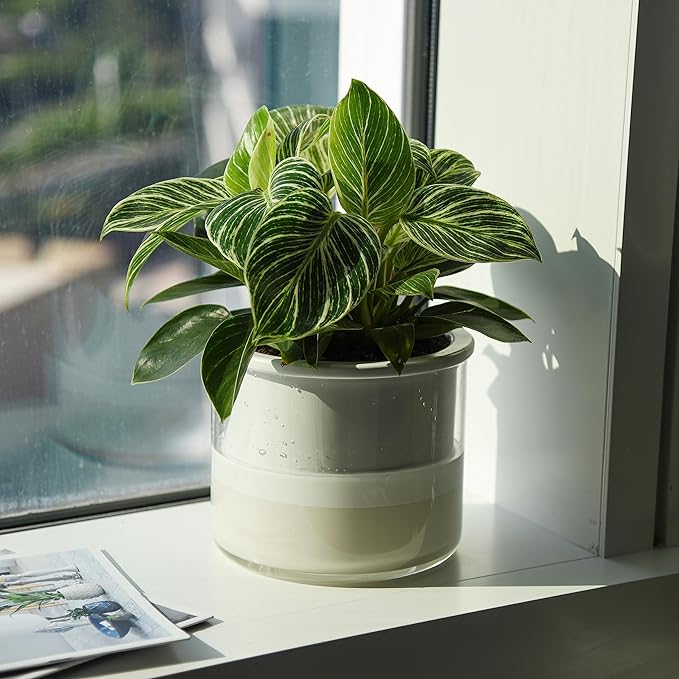 - Self-watering System: The bottom section of the white terracotta pot is unglazed, just fill the glass container with water to ensure plants will absorb only what they need through the terracotta pot walls.