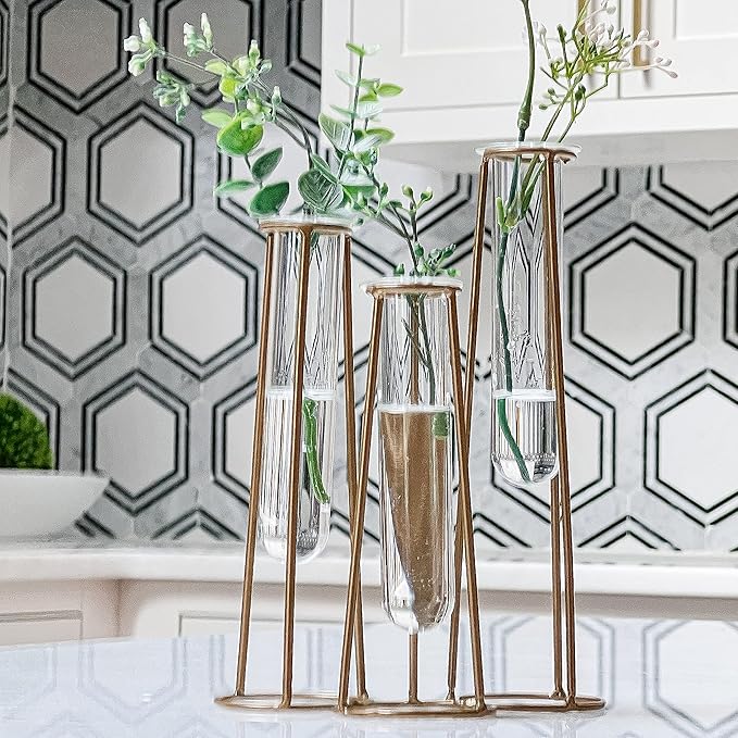- Looking for a housewarming gift, brithday present or a gift to yourself? This plant propagation station set of 3 test tube style vases in a metal base are perfect to accentuate shelf decor, mantle decor or use them as a table centerpiece.