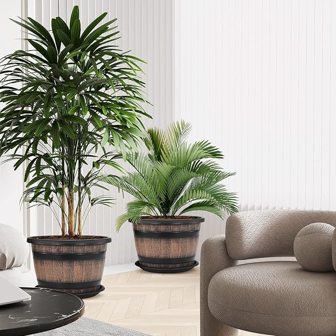 Quarut Large Plastic 3 Pack16 inch Plant Pots,Whiskey Barrel Planters with Drainage Holes & Saucer.Flower Pots Imitation Wine Barrel Design for Indoor & Outdoor Garden Balcony Plants.7 Gallons(Brown)