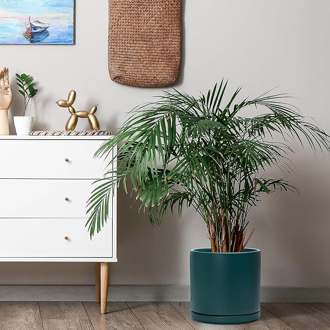 D'vine Dev 10 Inch Ceramic Planter Pot with Drainage Hole and Saucer, Indoor Cylinder Round Planter Pot, Teal, 94-O-E-9