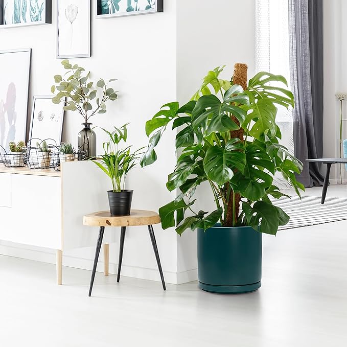 - Simple, elegant, and modern cylindrical straight round planter pot with saucer and drainage hole.
