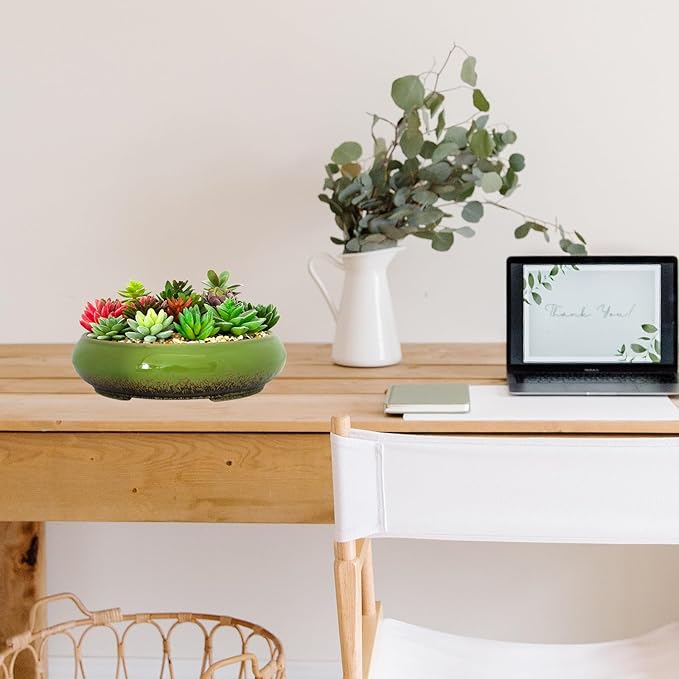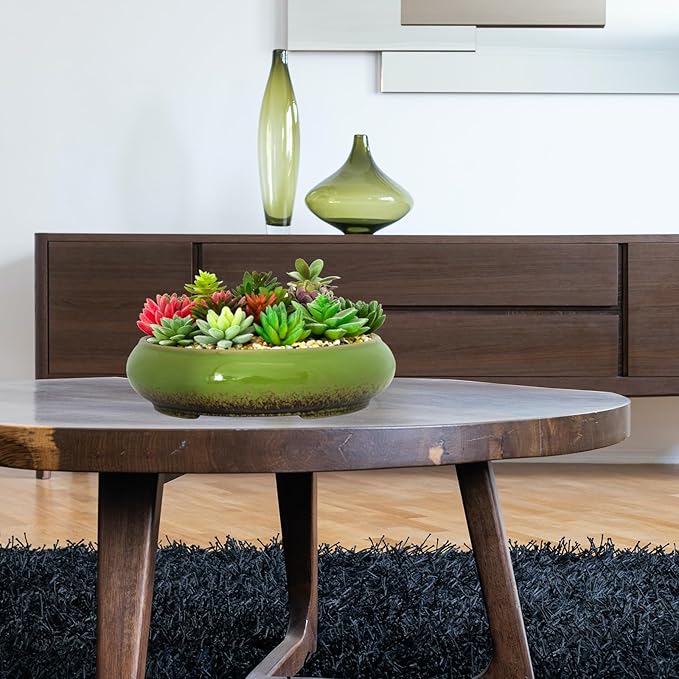 Succulent Pots - 11.5 Inch Ceramic Bonsai Pots with Drainage, Large Shallow Succulent Planters for Indoor Outdoor Plants, Round Glazed Cactus Flower Plant Container Bowl Home Desk Decor(Green)