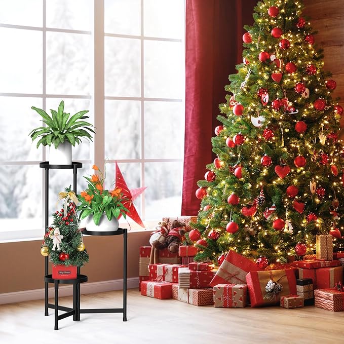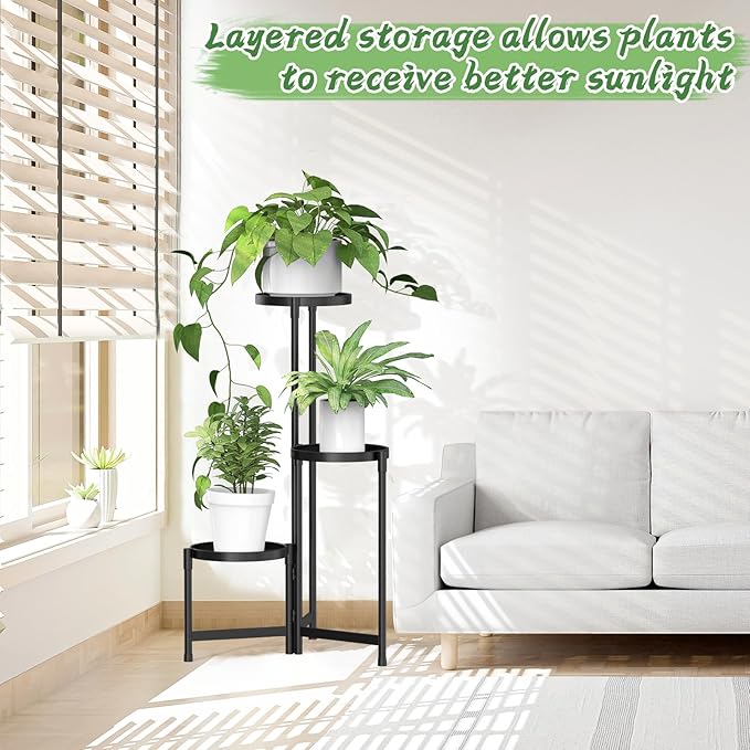 MOKANI Metal Plant Stand Indoor Outdoor for Multiple Plants, 3 Tiered Folding Corner Shelf Tall Flower Pot Holder Display Rack for Patio Living Room Balcony Garden, Black