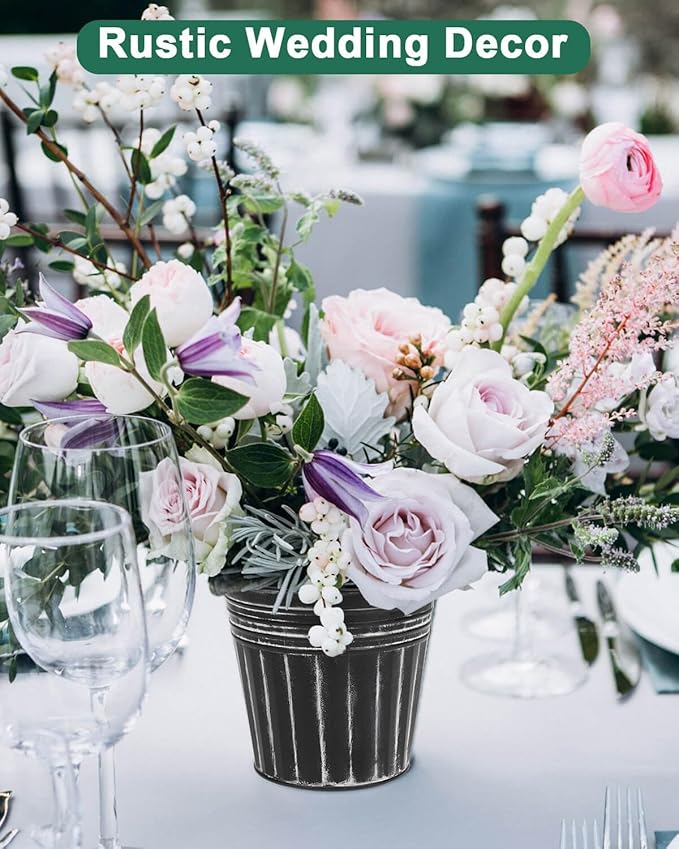 vensovo 5 Inches Black Metal Rustic Flower Pots - 6 Pcs Small Galvanized Planters with Drainage Hole and Rubber Plug, Rustproof Tin Bucket Plant Pot Farmhouse Vintage Style for Decor