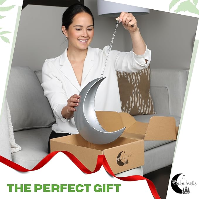 - Hand crafted perfection: Each 12-inch crescent moon planter is hand-painted and crafted from high-quality, rust resistant, galvanized metal, ensuring long lasting durability. Perfect for both an indoor hanging planter or outdoor hanging planter. Each metal planter is unique and easy to hang with a 24-inch chain and hook.