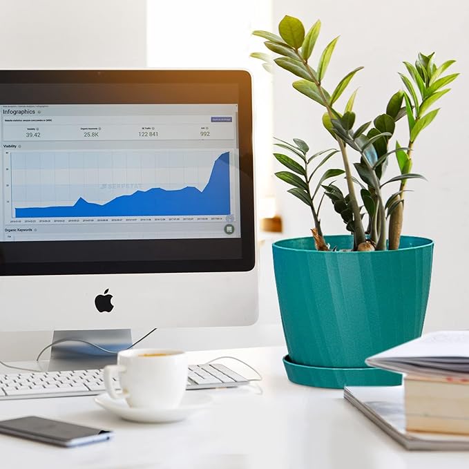 7 Inch Plant Pots Bulk, 6 Pack Plastic Planters with Drainage Holes and Saucers for Indoor Outdoor House Plants and Flowers, Green