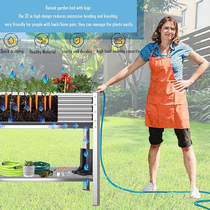 - 【Metal Garden Bed Long Service Life】 These large metal raised garden beds the planting box of the garden bed is galvanized sheet, the planting boxes bottom plate and storage shelf is a High carbon steel shelf, the 4 legs are Thickened galvanized plate column with drainage holes, anti-rust sturdy and durable, the 8 corners above and below the raised garden bed are protected with PC pads, Effectively prevents scratches to people and floors, that have a high load-bearing capacity and last longer.