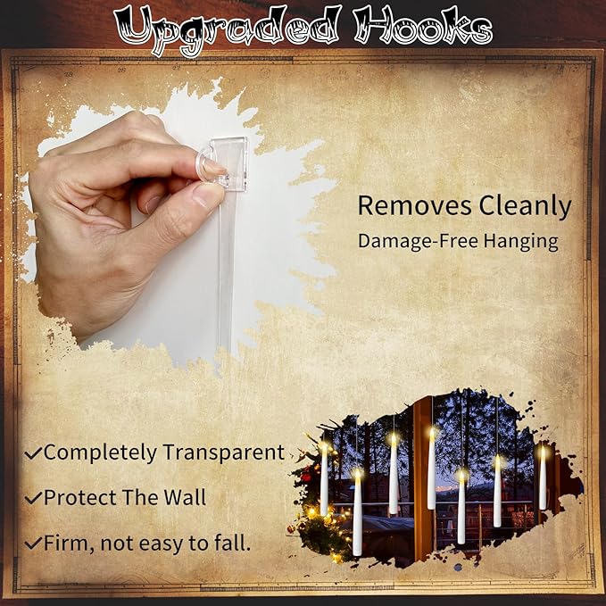 - 【FLOATING CANDLES】It's a fun way for children to hanging candles into the ceiling or fix these electric candles on the window, wall or Christmas tree decoration with hook , perfect room decor for Halloween decorations, church services, window candles, the fireplace, table, home & outdoor decoration.