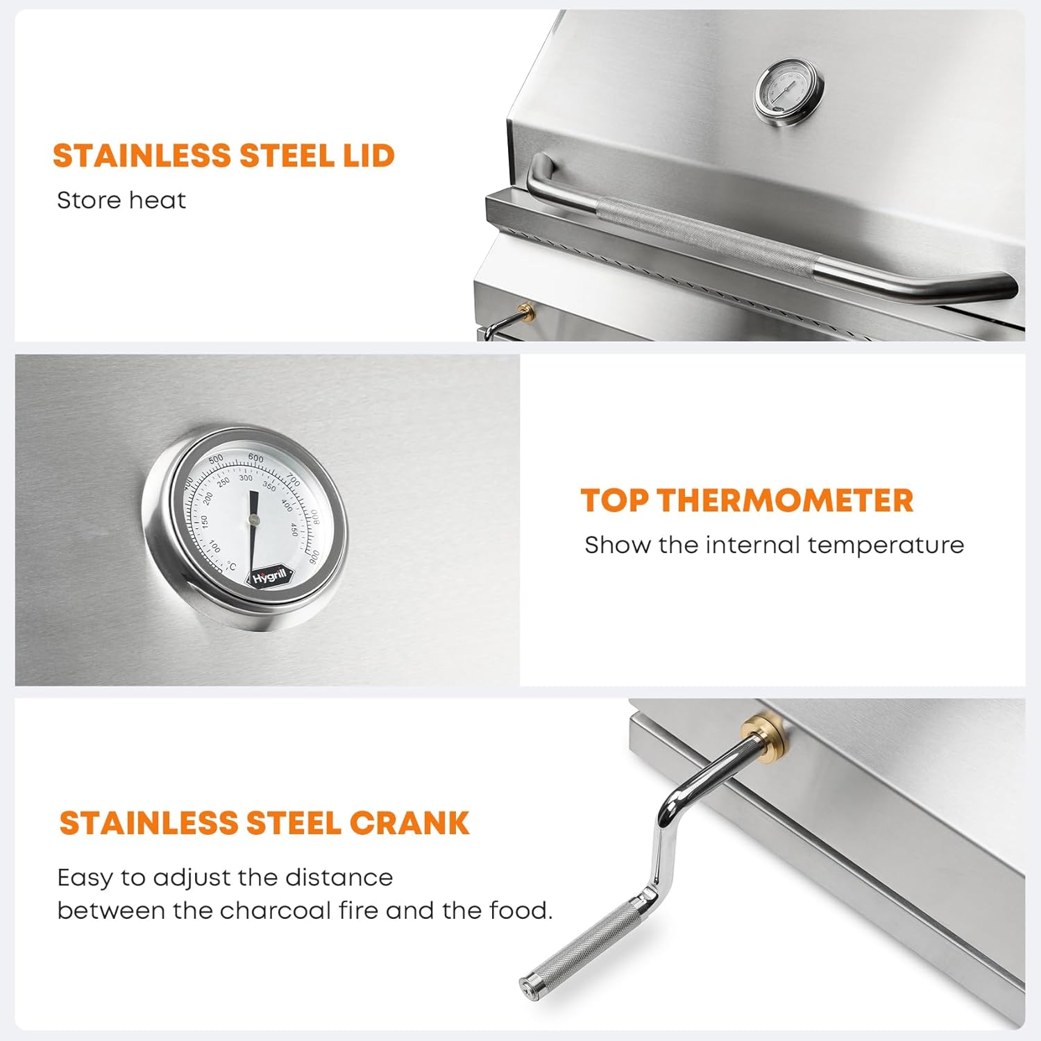 Hygrill Charcoal Grill Head for Outdoor Kitchen, 32-inch Stainless Steel Built-In Grill with Insulated Hood, Temperature Gauge and Fabric Cover