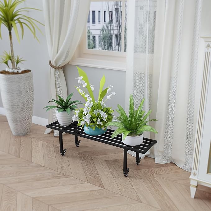 Zhongma One Tier Metal Plant Stand with Wheels,(35.43 L x 8.66 W x 10.3 H) Heavy Duty Plant Holder for Home, Window,Garden, Plant Lovers, Display Stand