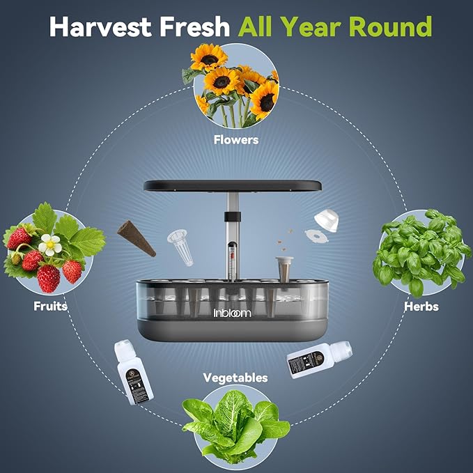 inbloom 12 Pods Hydroponics Growing System Kit, Herb Garden Planter Indoor Kit, Indoor Gardening Hydroponics Growing System with 4.2L Water Pump, Height Adjustable, Gifts for Woman, Transparent Black