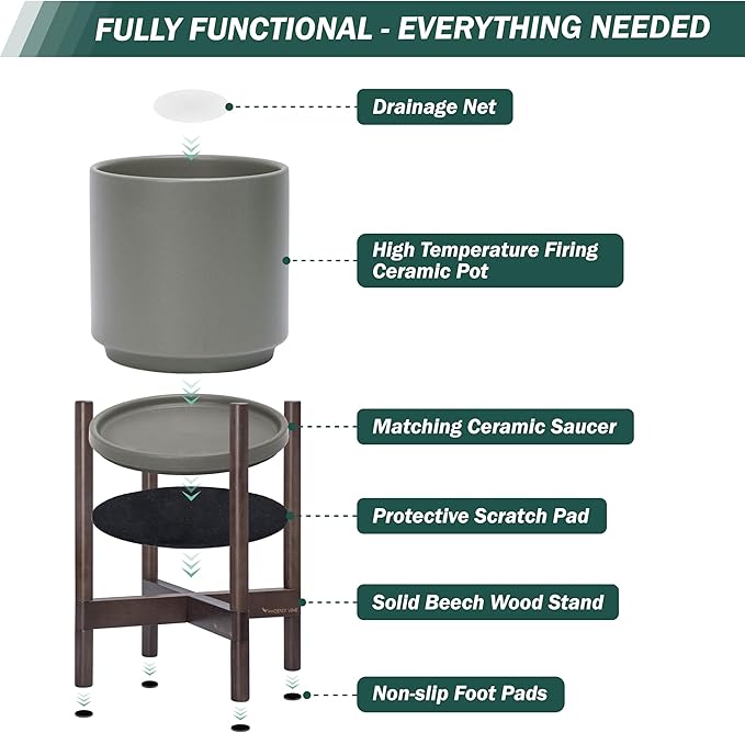 - A Complete Set: Mid-century ceramic planter, combined with a sculptural, solid wood stand that match perfectly together and looks great in anywhere.