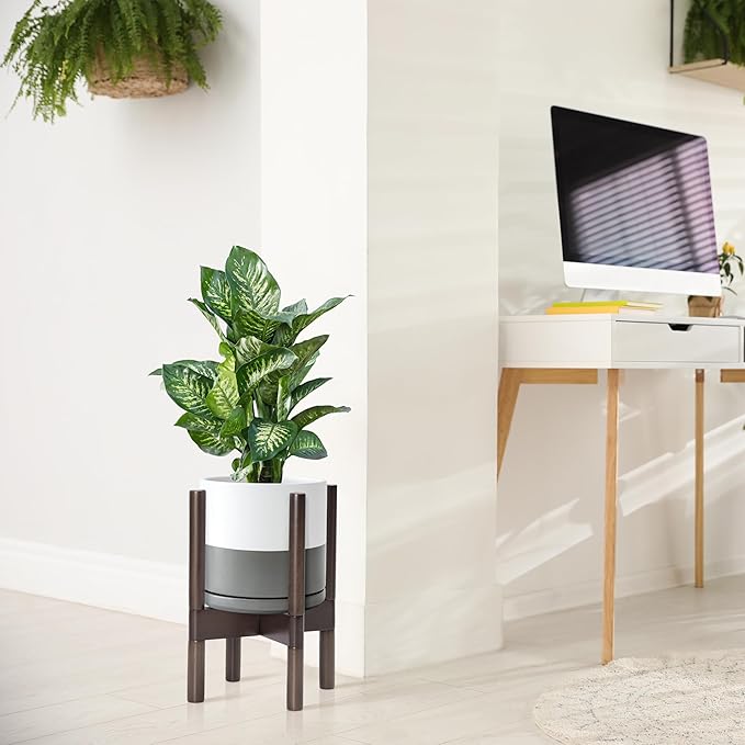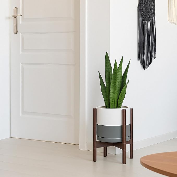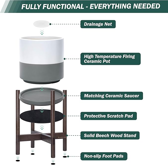 - A Complete Set: Mid-century ceramic planter, combined with a sculptural, solid wood stand that match perfectly together and looks great in anywhere.