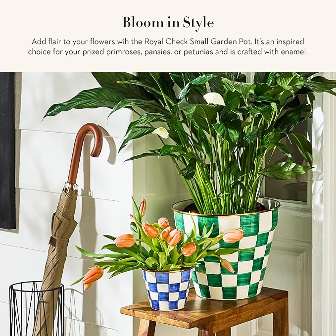 MACKENZIE-CHILDS Enamel Garden Pot, Decorative Pot for Plants, Outdoor Flowerpot Decor, Small, Blue-and-White Royal Check