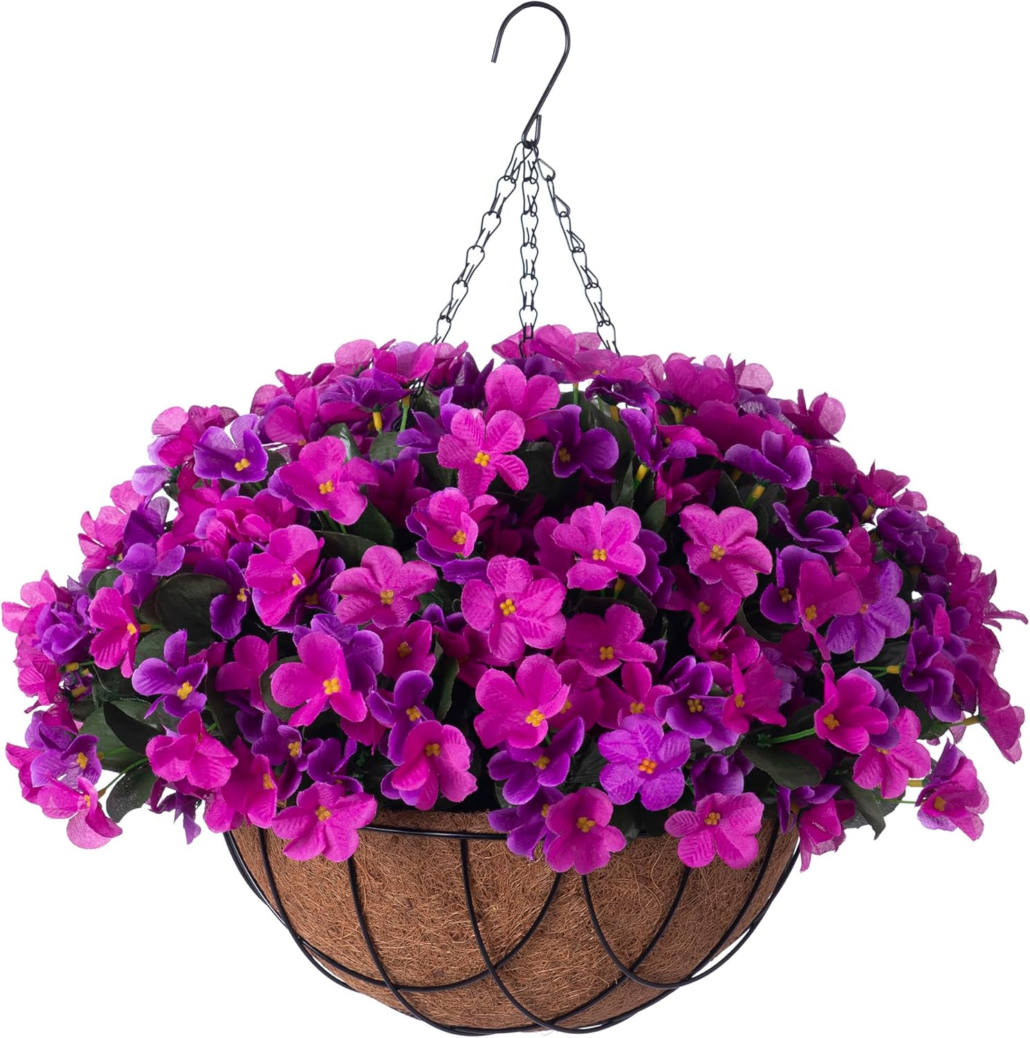 - Packaging: This beautiful faux hanging flower basket consists of Coconut Lining Flowerpot with chains, along with 4 pieces of artificial flowers. Each hanging branch is adorned with many forks of flowers and green leaves