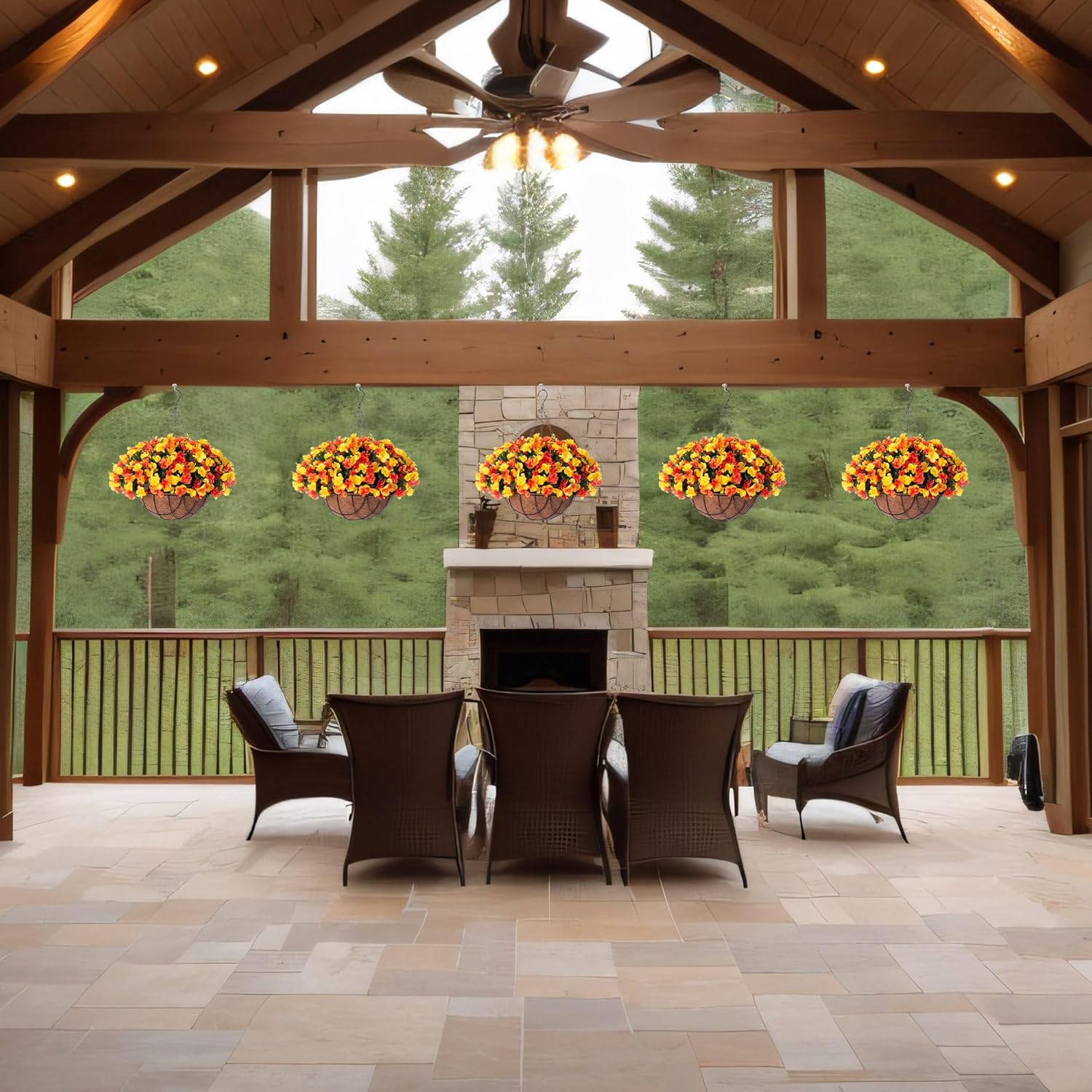 - Packaging: This beautiful faux fall hanging flower basket consists of Coconut Lining Flowerpot with chains, along with 4 pieces of artificial flowers. Each hanging branch is adorned with many forks of flowers and green leaves