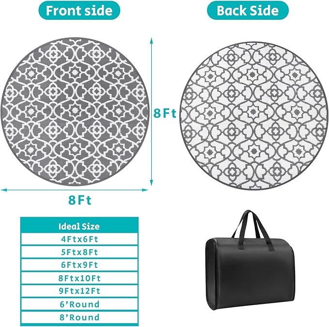 • Round Reversible Outdoor RV Mats 8Ft: The large 8 ft round outdoor porch rug with unique boho floral design, which makes it easy to use on patio,camper, deck, beach, backyard. And this outside camping rug is reversible, two-sided design allows you to have two different looks.