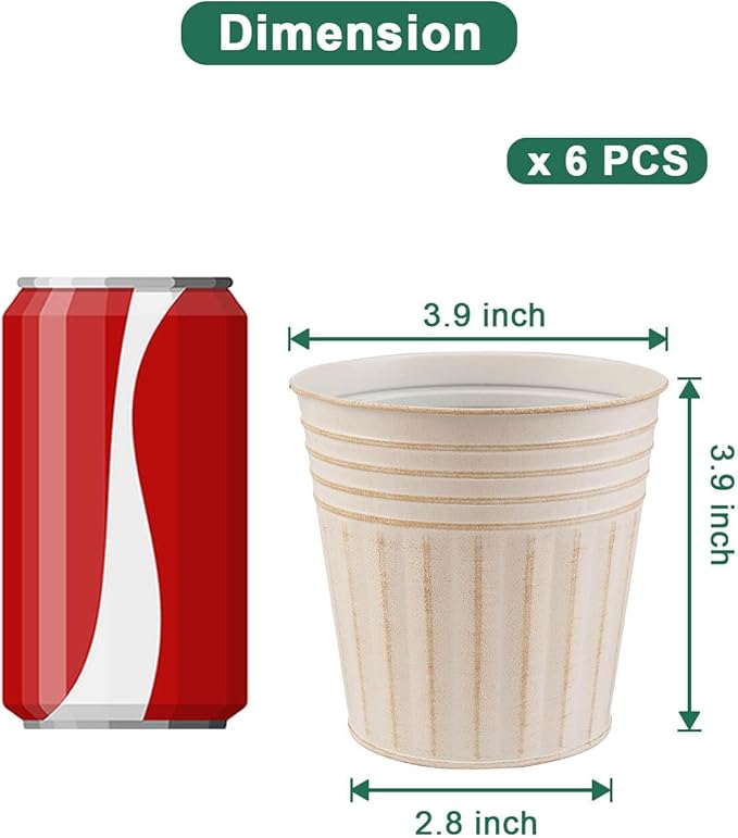- 【Size of Metal Pots】There are 6pcs metal planters in a package, Topper opening diameter 3.9 inch, bottom diameter 2.8 inch, barrel high 3.9 inch.